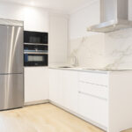 Cocina totalmente amueblada con armarios altos y bajos, cajoneras con herrajes alemanes Hettich y equipada con electrodomésticos de alta gama y alta eficiencia energética: